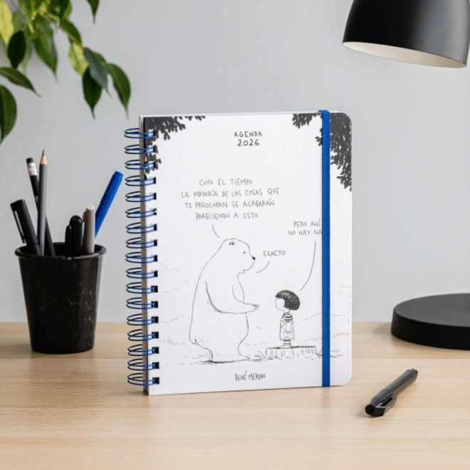 La agenda anual 2026 de René Merino incluye nuevas viñetas que mezclan humor, ternura y caos cotidiano. Con espacio amplio para escribir, stickers ilustrados y diseño diáfano, es perfecta para quienes buscan una agenda que los entienda, acompañe y haga sonreír. Incluye 12 viñetas de las más aplaudidas por sus fans. Dibujos que te harán pensar, reír o simplemente sentirte un poco más comprendido en el día a día. La agenda mantiene su diseño limpio y funcional, con amplios espacios para escribir, planificar o soltar ideas, y viene acompañada de 4 páginas de pegatinas ilustradas por René para decorarla a tu gusto.