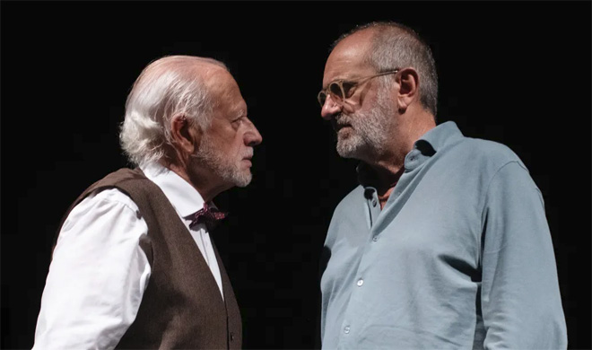 Obviamente a la creación de esa condición en el espectador, entre alucinado y absorto, coadyuvan el resto de los artífices responsables del montaje, desde la sobria puesta en escena que firma Carolina González a la atinada dirección de actores de Eduardo Vasco, que potencia la precisa arquitectura teatral del texto modulando a la perfección el tempo de la acción, el contraste de caracteres y la intensidad de los clímax, contando, por supuesto, con el extraordinario trabajo de los actores. Ambos Joaquín Climent como Cecil y Juan Echanove como Pierre están formidables. Ofrecen una lección de contención y de escucha activa, convirtiéndose en dos personajes creíbles desde el minuto uno de la función, Cecil más apocado y disperso confesando sus cuitas y cogitaciones, Pierre más escéptico, resoluto y dueño de sí mismo dispuesto a seguir el juego a Cecil y gastarle bromas permanentemente en un constante toma y daca que se prolonga hasta el final de la pieza y que adquiere tintes verdaderamente dramáticos en el ritual de simulación de la última parte de la obra -ya mencionado- en la que Cecil a duras penas puede contrarrestar el ímpetu avasallador de un Pierre/Cromm desatado, apabullante, en un monólogo memorable de una calidad técnica excepcional y de una fuerza arrebatadora.
