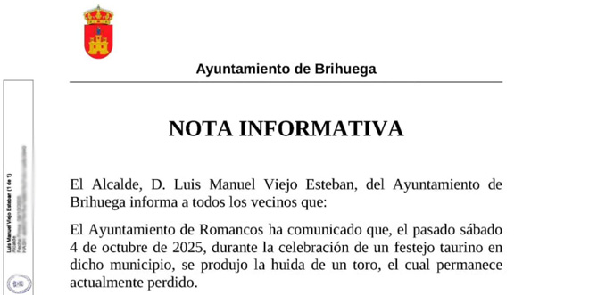 El Ayuntamiento de Brihuega ha emitido en la tarde de este miércoles 8 de octubre una nota informativa en la que se se pone en conocimiento de todos los vecinos que el vecino Ayuntamiento de Romancos les ha comunicado que, el pasado sábado 4 de octubre de 2025, durante la celebración de un festejo taurino en dicho municipio, se produjo la huida de un toro y que a fecha 8 de octubre aún sigue perdido.
