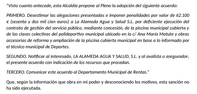 Posteriormente, en 2021, el entonces alcalde José Luis Blanco llevó otra propuesta al pleno para sancionar con 62.100 euros a dicha empresa por ‘deficiente ejecución del contrato de gestión del servicio público’.
